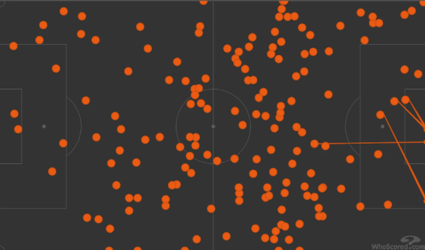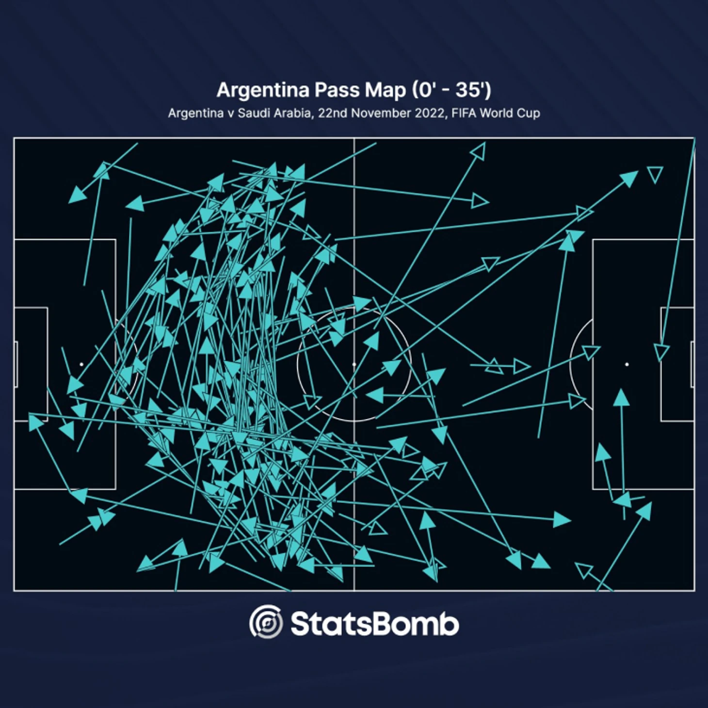 Это привело к радикальному эффекту. Аргентина играла вперед исключительно забросами – это заметно на карте передач до 35-й минуты. Саудовская Аравия позволяла владеть мячом и перекатывать его на своей половине, но полностью выжигала среднюю линию. По данным Whoscored, Аргентина сделала 17 точных длинных передач за всю игру, а в первом тайме при большем владении проиграла по передачам в финальной трети (30 из 49 сделали в конце тайма, когда Саудовская Аравия села глубже).