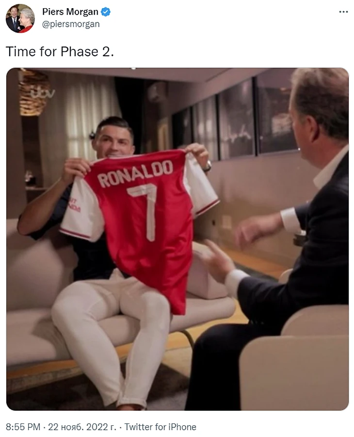 И почти одновременно с этим тот самый Пирс Морган у себя в Твиттере выложил пост с Роналду и подписью «Время для 2-й фазы».