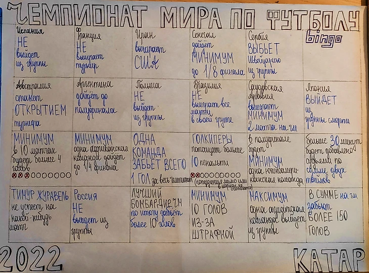 Убедившись, что произойти на этом чемпионате мира может всё что угодно, представляю вашему вниманию свой бинго с довольно громкими заявлениями, которые интуитивно образовались у меня в голове ещё до начала чм.