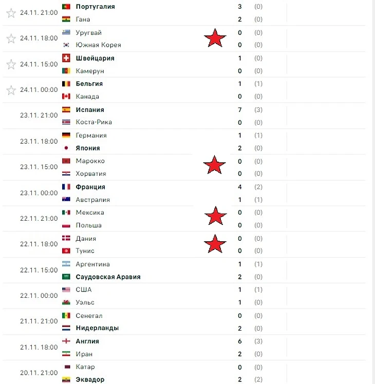 Победа Саудовской Аравии и Японии, а также борьба Сенегала и Ганы уже заставили сильные сборные Аргентины, Германии, Нидерланды и Португалии испытывать трудности. Если две последние сборные добыли свои победы, то Аргентина и Германия после первого тура имеют 0 очков в своих группах.