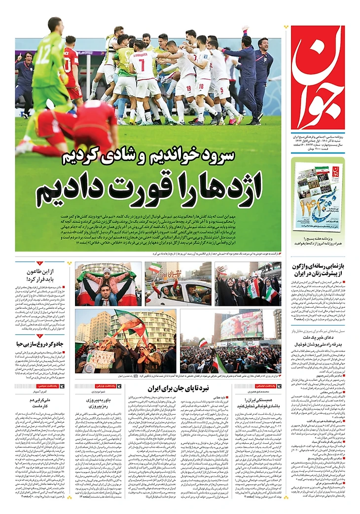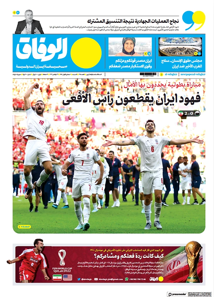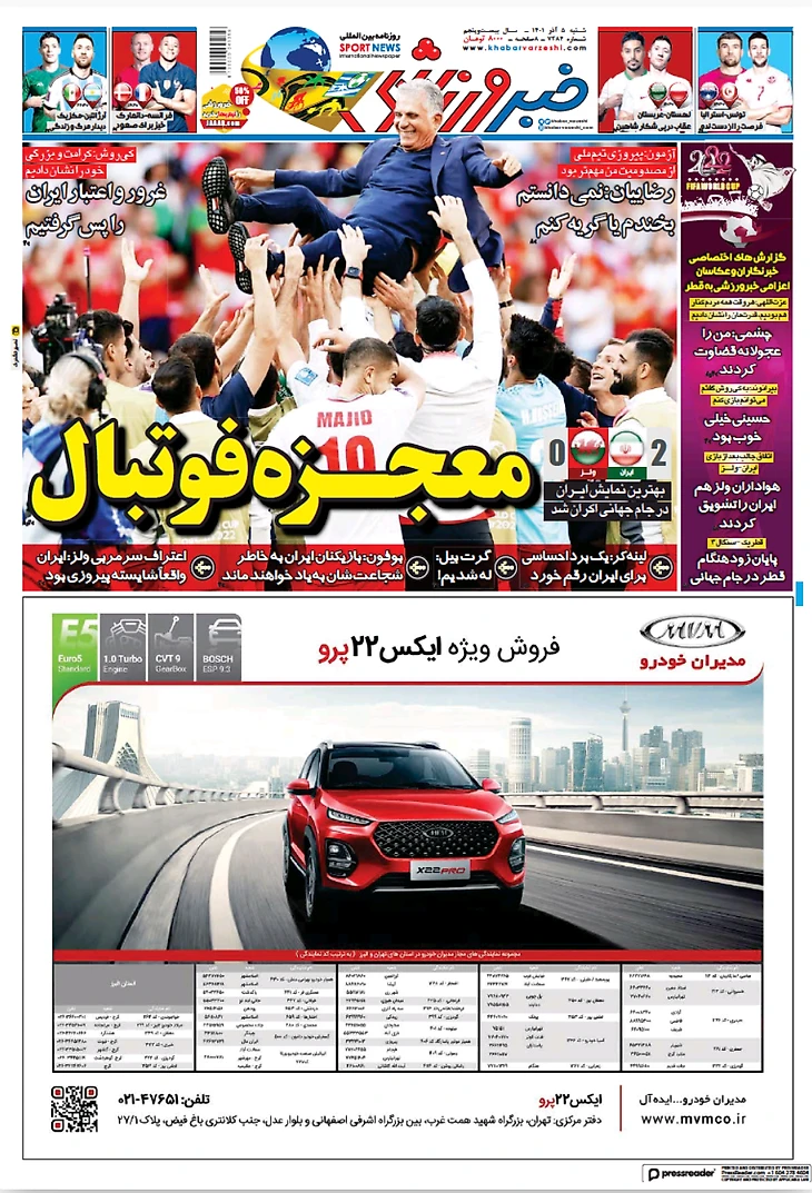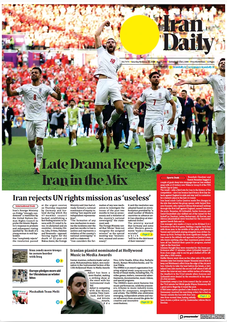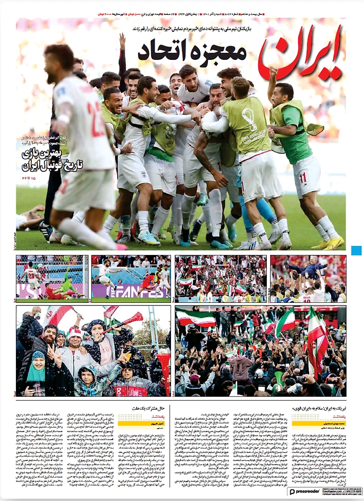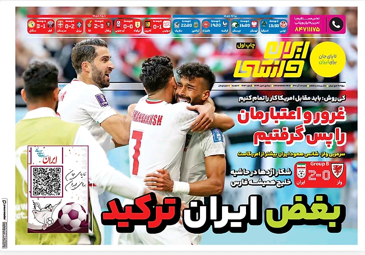 Сборная Ирана в добавленное время забила два гола Уэльсу и претендует на выход из группы. Футболисты подарили себе и стране, в которой уже два месяца продолжаются протесты, вечер счастья. Все субботние иранские газеты посвящены героям!