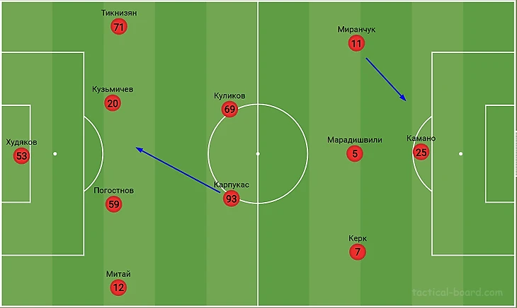 Против Пари НН Локо вышел со схемой 4-2-3-1. Карпукас и Куликов в опорной зоне, Миранчук на левом фланге со смещениями в центр, Керк на правом фланге, Марадишвили играл под нападающим Камано. В защите на правом фланге вышел Марио Митай, в центре была пара Кузьмичев-Погостнов, левый фланг традиционно закрывал Тикнизян. Без мяча Локомотив накрывал игроков Пари НН четверкой Миранчук, Марадишвили, Керк, Камано. Из полузащиты давление поддерживали Куликов и Карпукас. Локомотив показал хороший прессинг перфоманс: давление было цельным. Этого совсем не было при Комппере. При владении Карпукас опускался к центральным защитникам для продвижения мяча, Куликов оставался выше. Миранчук созидал из левого полуфланга со смещениями в опорную Пари НН. Локомотив хорошо держал мяч и создавал моменты через комбинации. Да, в игре с мячом есть ошибки и необязательные потери мяча, но это объяснимо. Команде при новом тренере нужно время для отладки всех механизмов и связей. Карпукас играет огромную роль в игре Локомотива при владении: фантастическая способность Артема продвигать и удерживать мяч под любым давлением помогает Локомотиву сохранять мяч даже в самых сложных ситуациях. Карпукас — это российский Станислав Лоботка. Из других персональных перфомансов отмечу Погостнова и Митая: первый показал прекрасный первый пас, второй — на голову лучше Живоглядова и Ненахова во всех аспектах, и уже должен играть в основе. В целом, Локомотив произвел положительное впечатление. Прогресс при Галактионове впечатляет во всех аспектах. Будем следить дальше, но уже в следующего году.