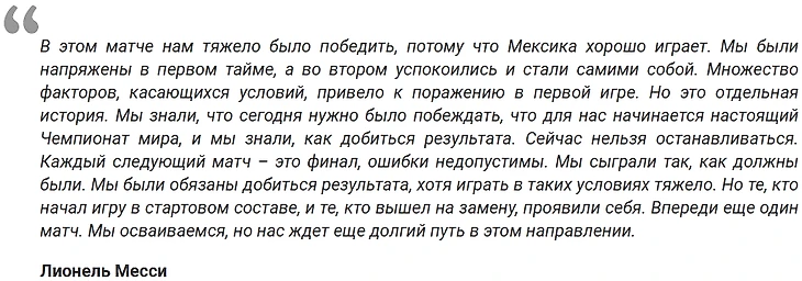 Никто из нас не ожидал такого начала Мундиаля для сборной, но, что случилось – то случилось. Скажу сразу главный тезис, что поддерживал меня в перерыве между первыми двумя турами – лучше проиграть первый матч, чем последний. Кто должен был обратиться к болельщикам, если не капитан и тренер? Абсолютно искренне и честно.