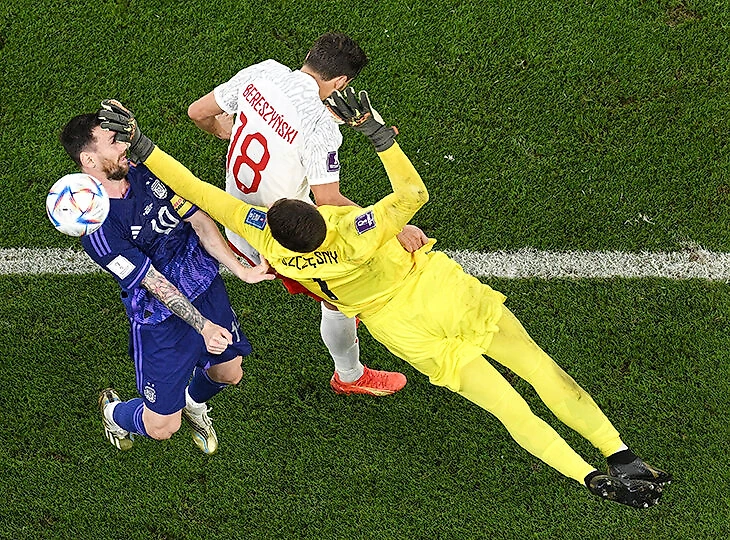 На этом атака не захлебнулась: пошла мгновенная подача с левого фланга на дальнюю штангу, куда мчался Месси. Шченсны тоже вышел на мяч, они вместе прыгнули, и Войчех вынес, но Лео рухнул на газон и держался за лицо. Казалось, ничего страшного, назначат угловой, но арбитр ждал вердикта ассистентов.