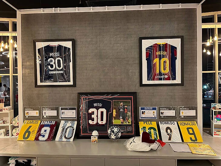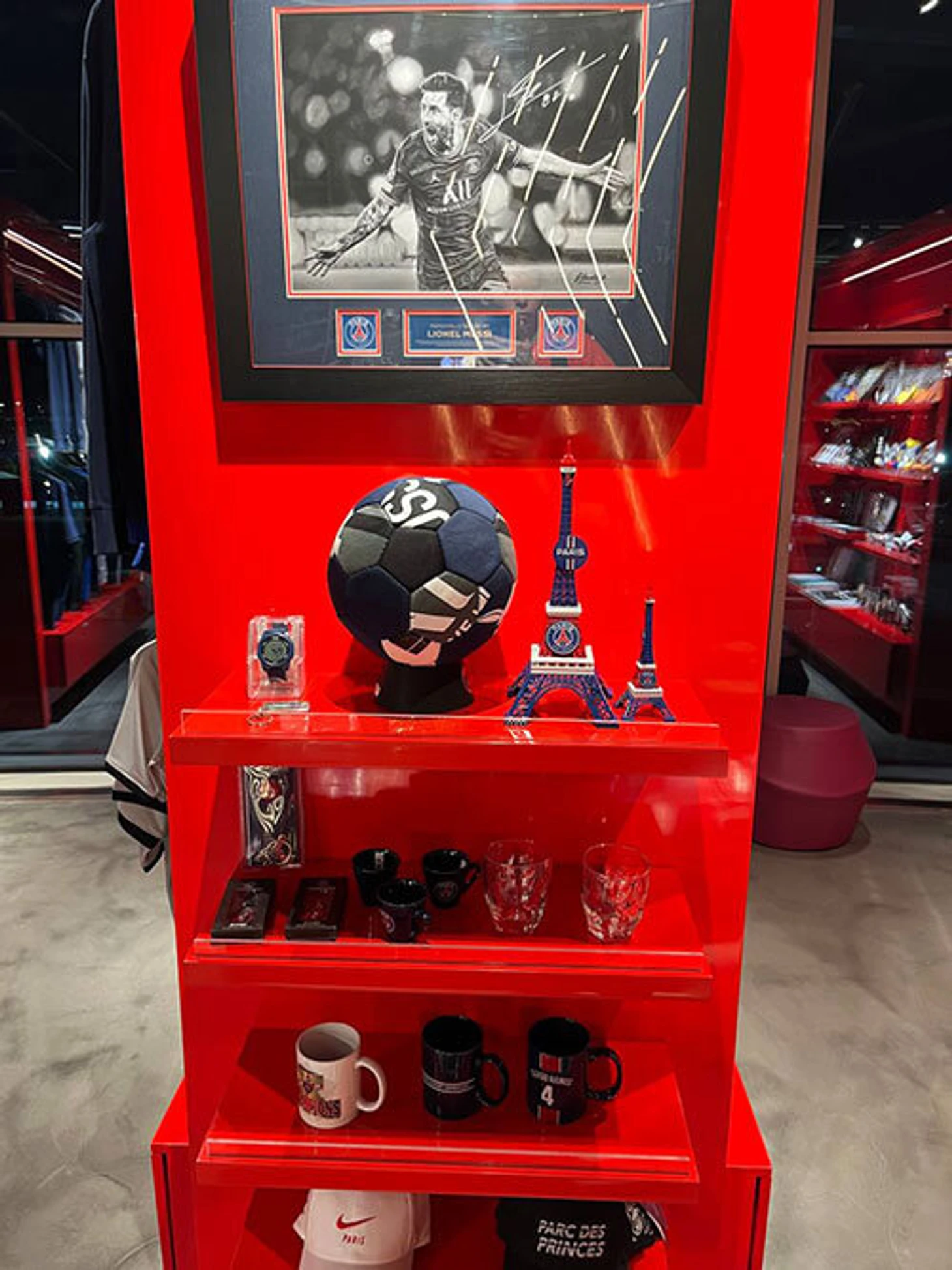 Лео посвятили отдельный стенд – мячики, кружки, кепки, автографы, часы и Эйфелевы башни.