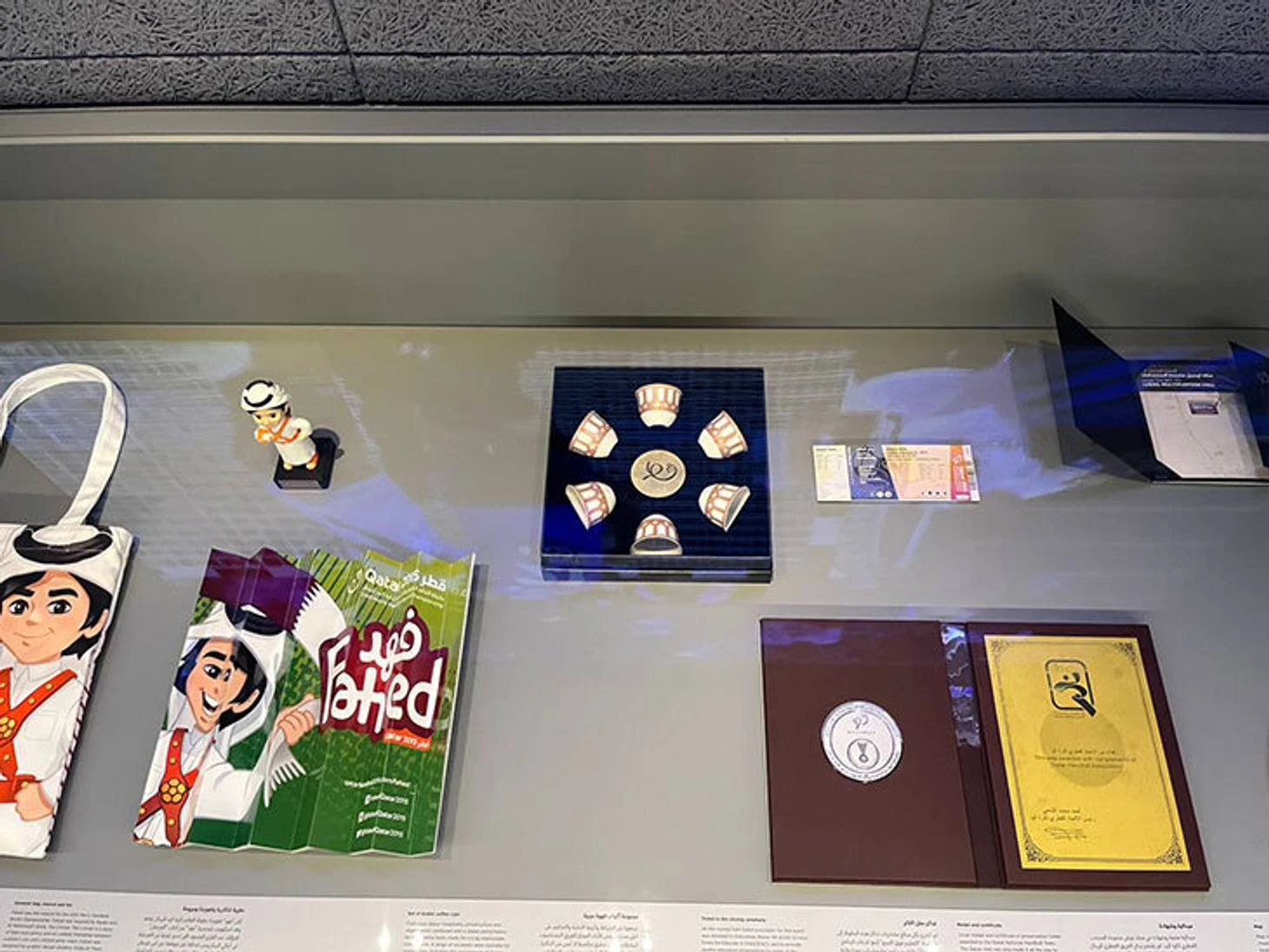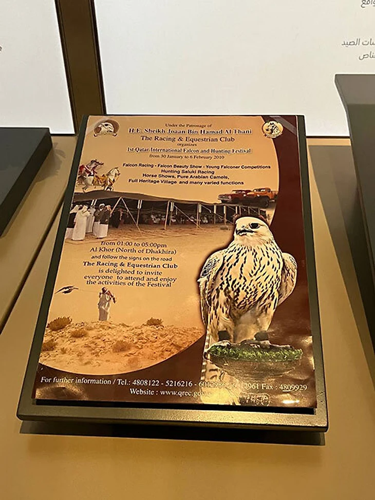 Есть и экспозиция национальных видов спорта Катара: скачки на лошадях, охота с хищными птицами и гребля на лодках. Среди экспонатов – сабли, бедуинские головные уборы и флайер фестиваля соколиной охоты.