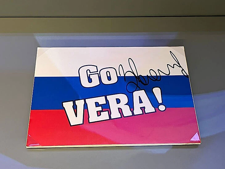 В теннисе экспонаты посолиднее – ракетка Серены Уильямс, футболка с автографом Надаля и российский флаг с надписью: «Go, Vera». Вера Звонарева – победительница Qatar Open-2011.