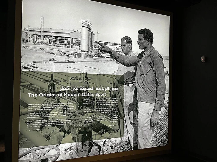 Катарцы абсолютно не стесняются того, что их главные спортивные достижения связаны с проведением соревнований и спонсорством топ-клубов. Они даже гордятся этим. Стенд о современном спорте в Катаре начинается с рассказа про нефть. Где и когда ее нашли, как рабочие с вышек гоняли мяч и занимались спортом.