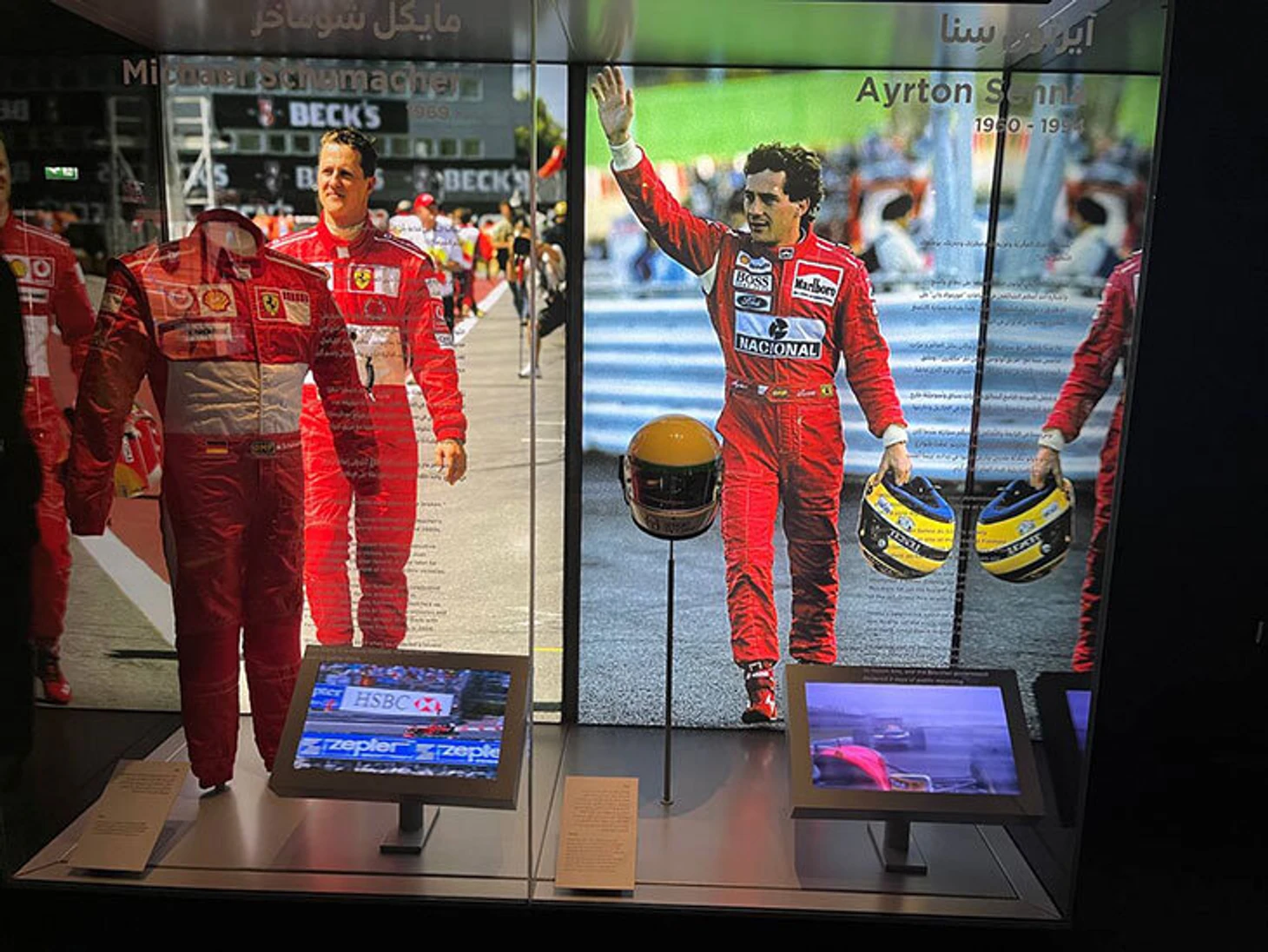 Напротив костюм Михаэля с Гран-при Германии-2006 и шлем Айртона Сенны сезона-1984.