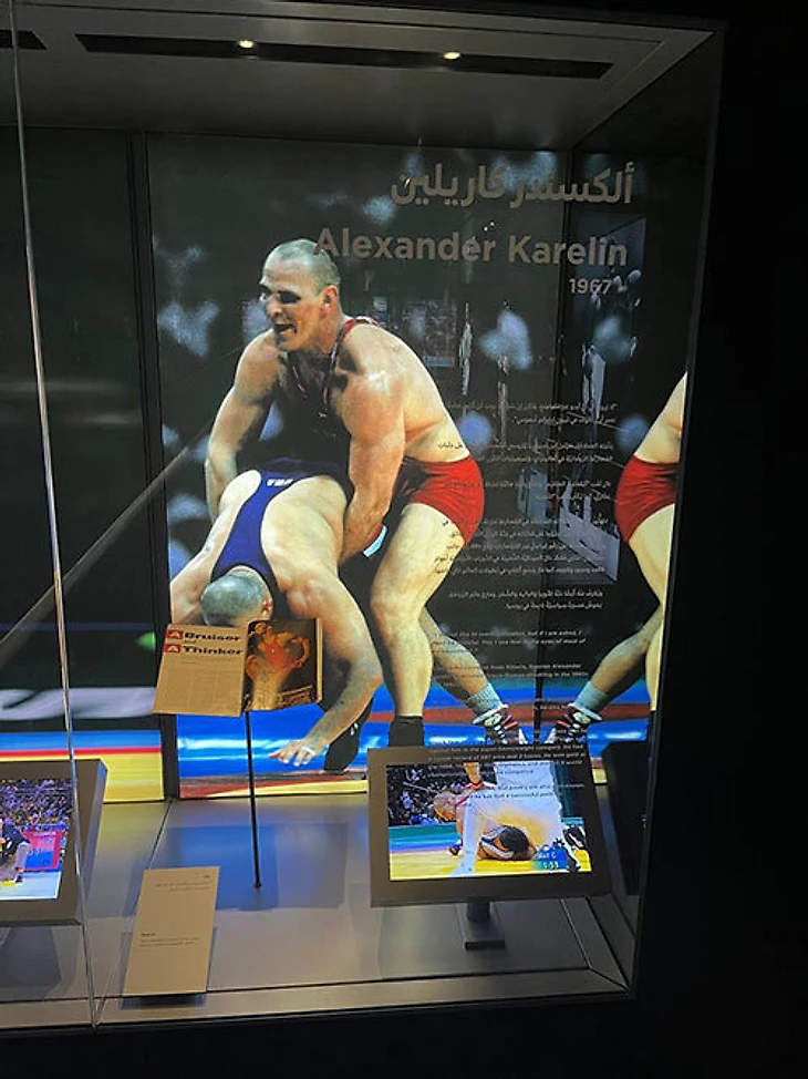 На самом деле, это выглядит внушительно. Почти полтора этажа занимают стеклянные кабины с фотографиями, хроникой и вещами, связанными с легендами мирового спорта. Правда, есть ощущение, что катарцы очень хотели найти легенд в каждой стране, чтобы турист из любой части мира нашел здесь кого-то своего. Поэтому тут гандболист из Хорватии Ивано Балич, немецкий скелетонист Георг Хакль, австралийская бегунья Кэти Фримэн, голландско-новозеландская яхтсменка Лаура Деккер, саночница из Американских Виргинских островов Анна Абернати и боб сборной Ямайки по бобслею.