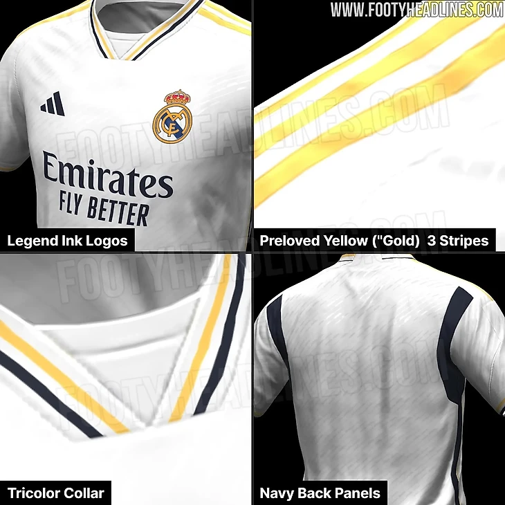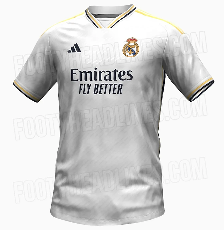 В сети появился дизайн формы «Мадрида» на сезон 2023/24. Портал FootyHeadlines поделился изображениями новых футболок с тремя золотыми полосами.
