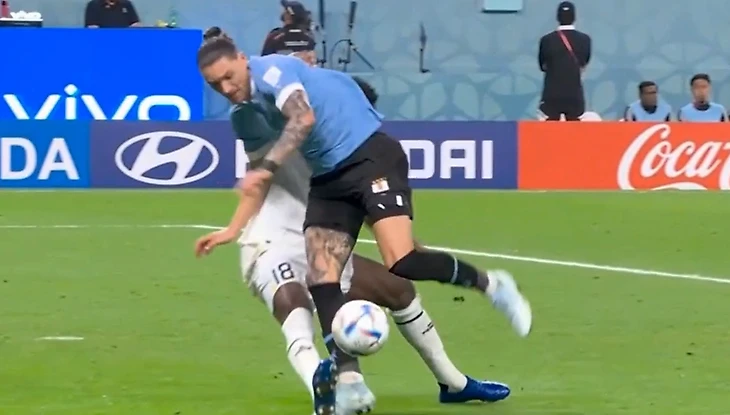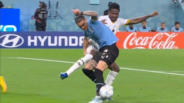 В единоборстве с Сейду уругваец подставлялся под фол: вместо того чтобы бежать к мячу, он выставил ногу в направлении движения соперника.