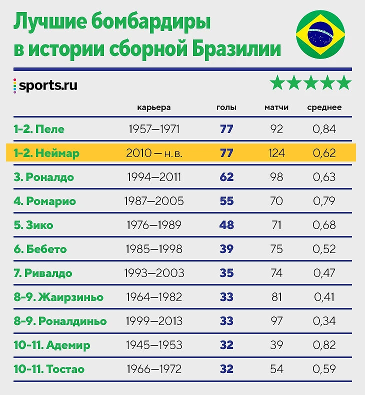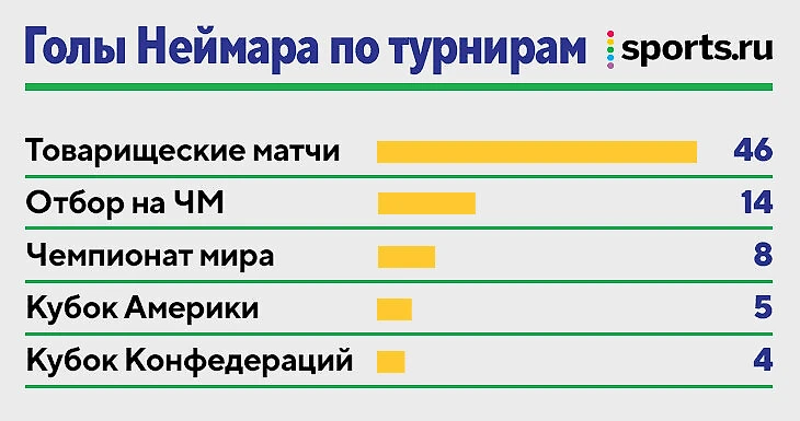 • Большая часть голов Нея (46, то есть 60%) – в товарищеских матчах: у Бразилии не было отбора на домашний чемпионат мира-2014. У Пеле схожая ситуация: 51 мяч в товарняках.
