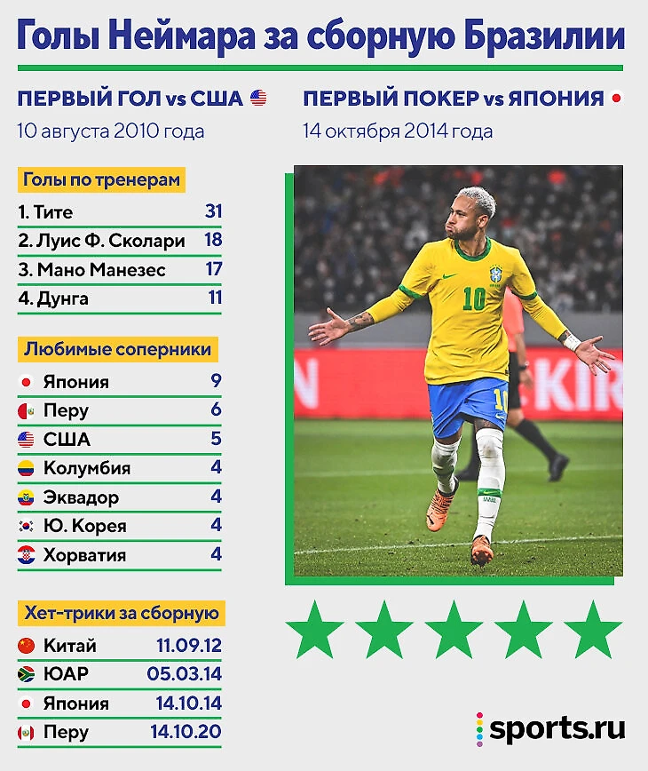 Тут голы Неймара при разных тренерах, любимые соперники и хет-трики за сборную.