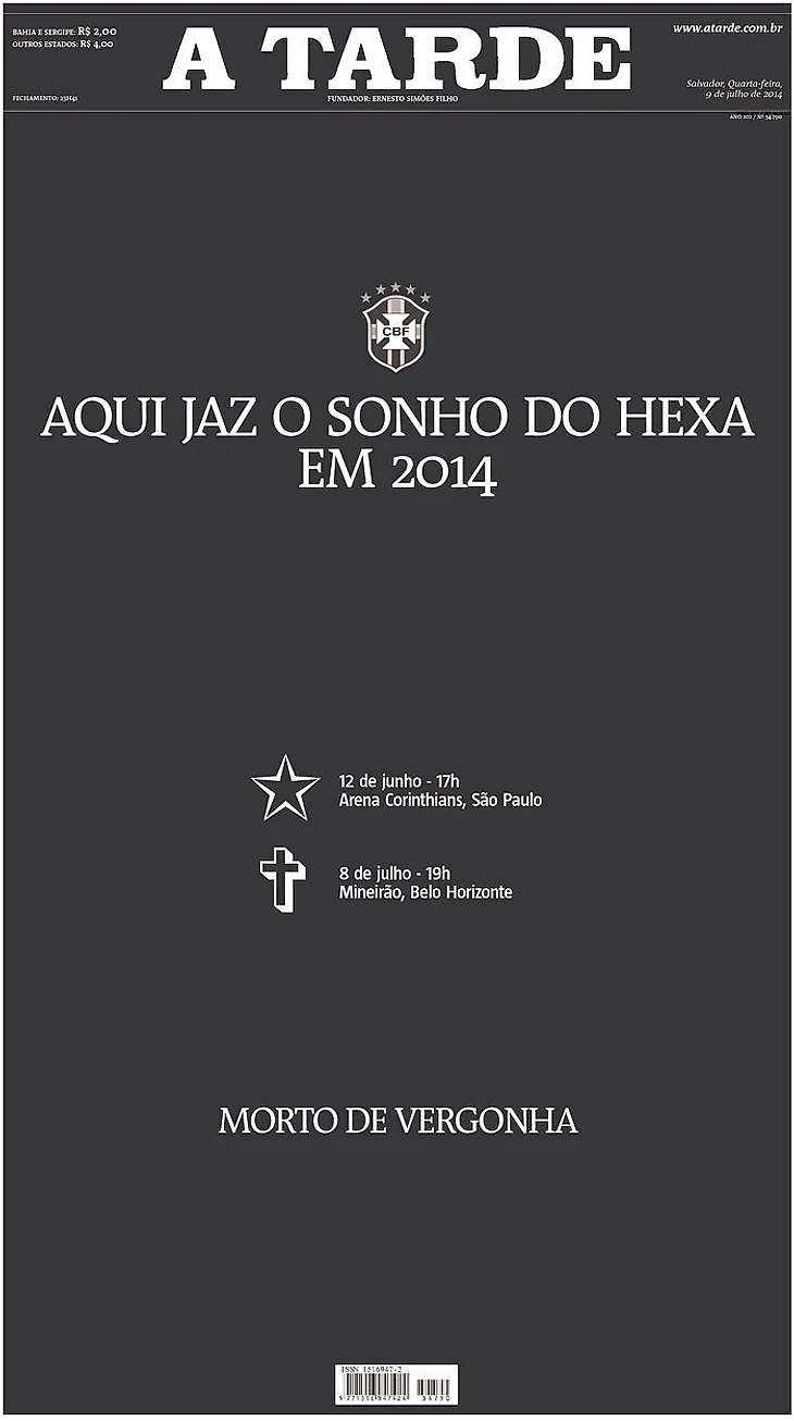 Вообще похоронные обложки – к сожалению для бразильцев уже превращаются в традицию. Когда сборная дома в 2014-м получила 1:7 от Германии в полуфинале, выходила вот такая первая полоса. Как надгробие.