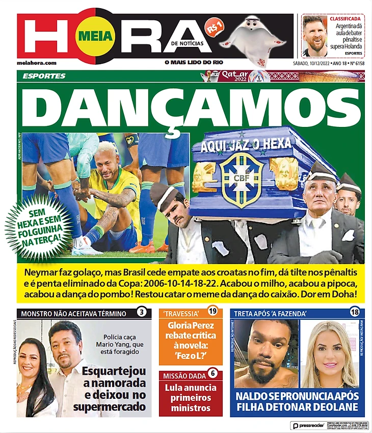 У Meia Hora самая многогранная обложка: глагол Dançamos можно перевести как «Потанцевали», а можно (и это уже бразильский сленг) «Провалились». А еще на обложке похороны, надпись на гробе: «Здесь лежит шестое чемпионство».