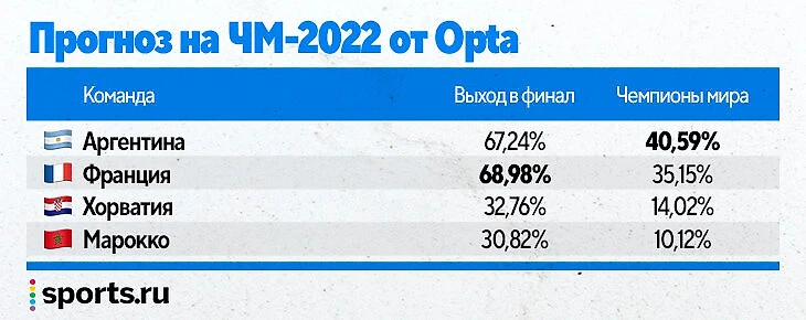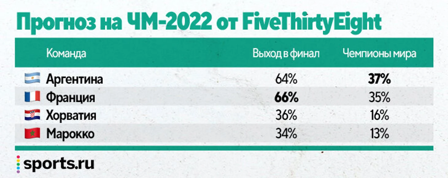 Аргентина и Франция шли в топ-4 фаворитов, но проценты FiveThirtyEight на победу были минимальные – 9 и 8. А вот на полуфинал – 33.