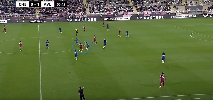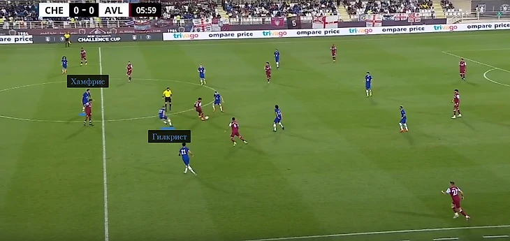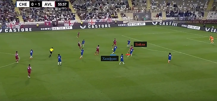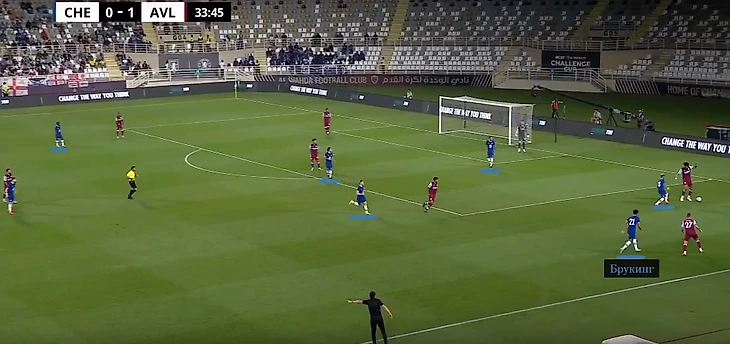 В товарке с «Астон Виллой» «Челси» отбивался по схеме с двумя центральными защитниками. Для прессинга Поттер использовал группу из пятерых футболистов. Центральный нападающий (Армандо Броя, после травмы албанца – Пьер-Эмерик Обамеянг) давил вратаря. Восьмерки (Льюис Холл и Чарли Уэбстер) накрывали полузащитников. Вингеры (Рэнкин плюс Омари Хатчинсон) следили за центрдефами или фуллбэками. Иногда к давлению подключались крайки: Марк Кукурелья и Джош Брукинг.