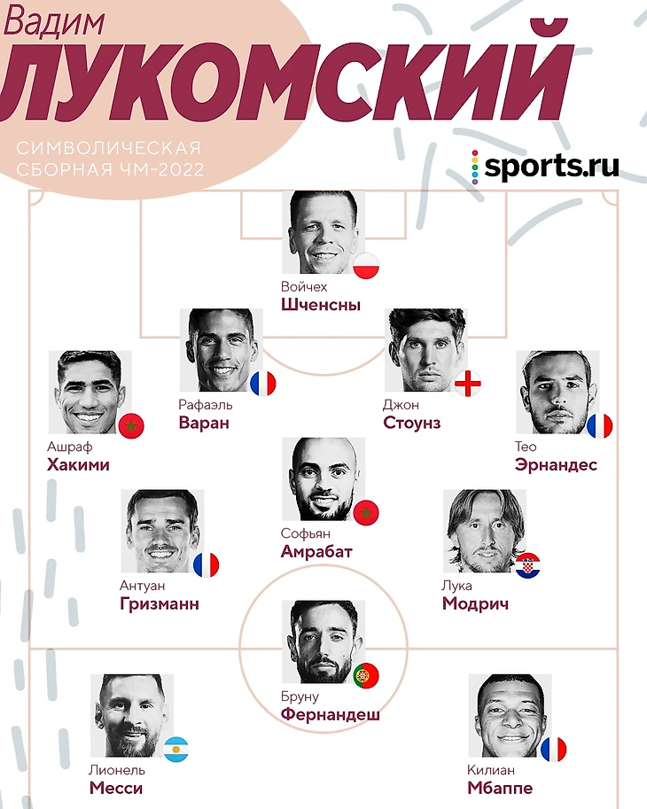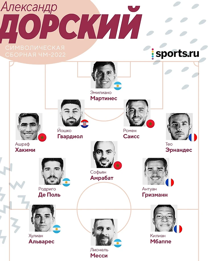 Для начала выделю позиции, которые мне видятся бесспорными (при желании можно придраться, конечно, но я тут выбирал не сомневаясь) – Хакими, Тео Эрнандес, Амрабат, Модрич, Гризманн, Месси, Мбаппе. Если они для вас не топы на этом ЧМ, мы смотрели разные турниры. По остальным пройдемся.