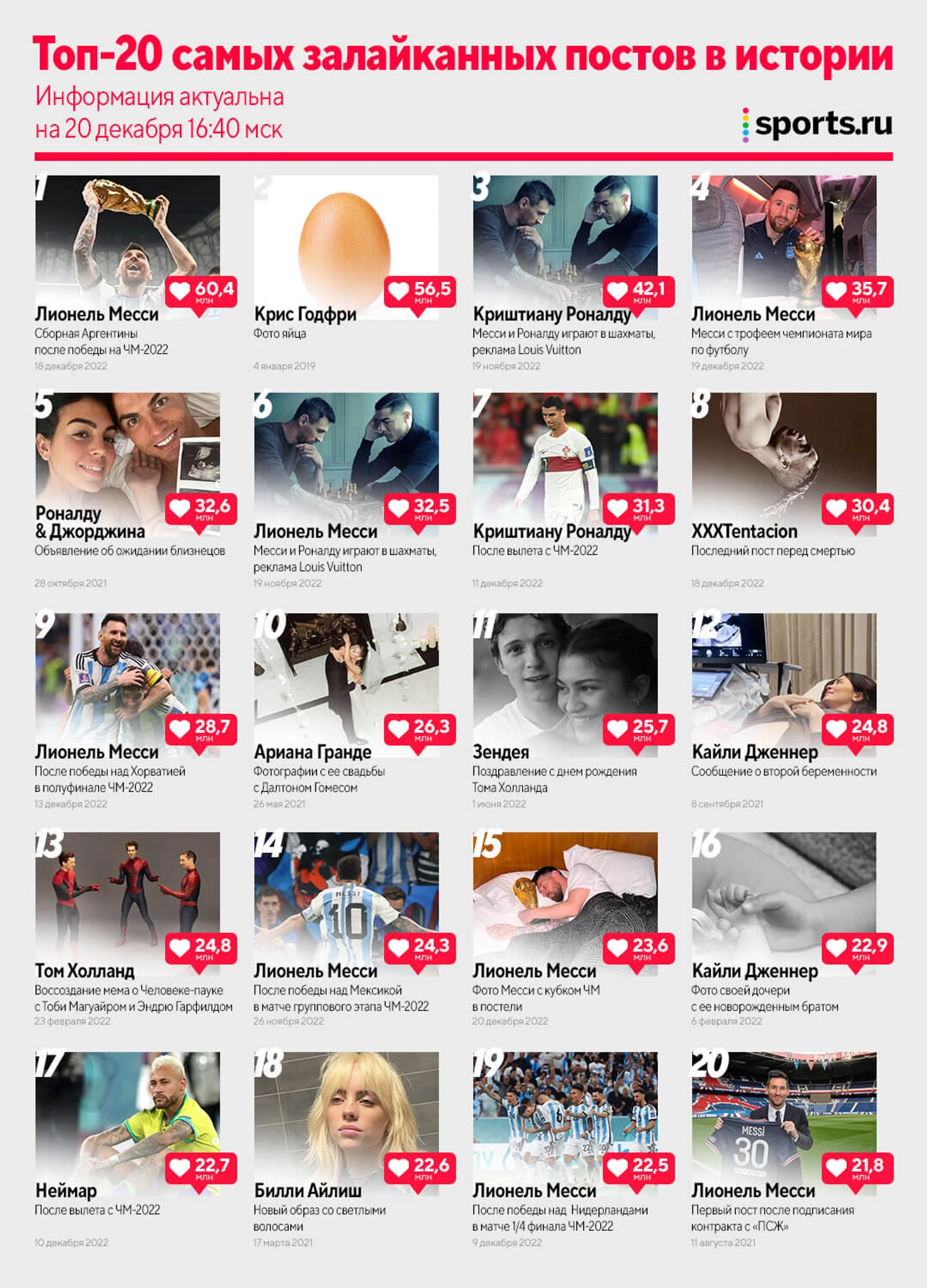 Теперь у Месси аж 8 публикаций в топ-20 самых залайканных в истории. Сильно помог этот ЧМ – с катарских полей в топ ворвалось уже 6 постов аргентинца и еще несколько на подходе. При этом из 20-ки вылетело фото с Кубком Америки, набравшее почти 21,8 млн лайков. Самые свежие посты Лео собирают десятки тысяч лайков в секунду, поэтому приводим топ на 16:40 по мск.