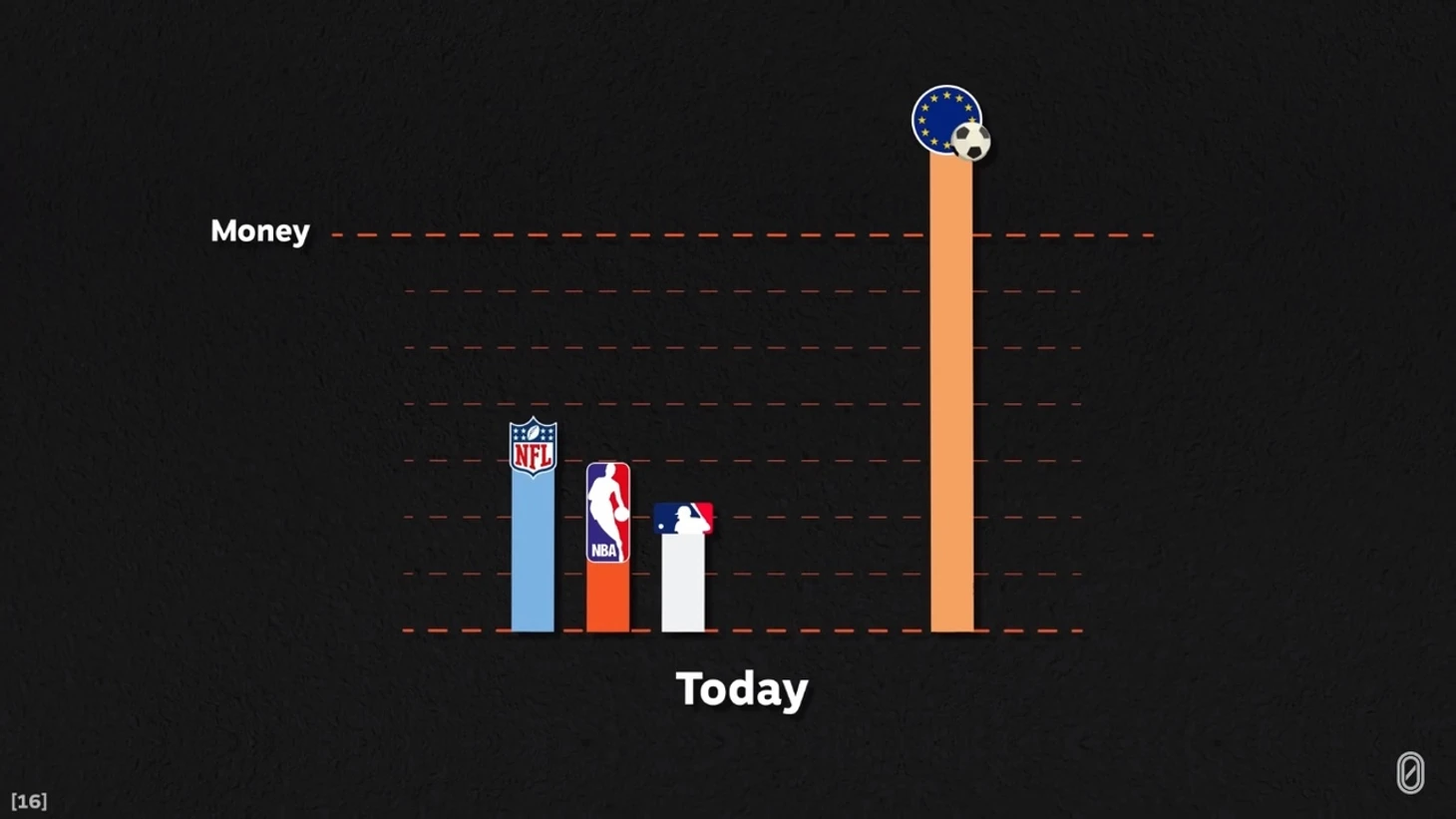 Тридцать лет назад весь европейский футбол вместе взятый приносил меньше доходов, чем MLB, NFL или NBA. Теперь, европейский футбол приносит больше денег, чем все эти три вместе взятые спортивные лиги.