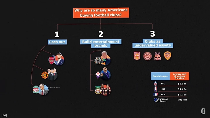 Рассмотрим третью и, возможно, самую значимую причину. Американские инвесторы относятся к европейским командам как к недооцененным активам, которые в будущем можно будет легко продать для получения прибыли. Поскольку их внутренний рынок американских спортивных команд сильно недооценен - они сосредотачиваются на европейском рынке, чтобы вкладывать свой капитал. ... это обеспечивается низкими процентными ставками, интересом телевещателей к прямым спортивным трансляциям и инвестиционной культурой, которая поощряет ставки с высоким вознаграждением. И это именно то, что они делают. Размещение ставок. Это навязывание американского опыта в спортивных состязаниях традиционному европейскому футбольному клубу принесет быструю финансовую выгоду.