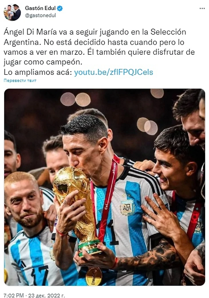 «Анхель Ди Мария продолжит играть в сборной Аргентины. Пока он не решил, насколько долго, но мы точно увидим его в следующих матчах. Он остается, потому что хочет получить удовольствие от игры в качестве чемпиона».