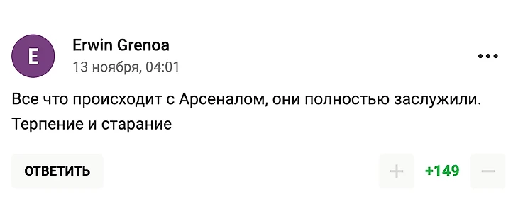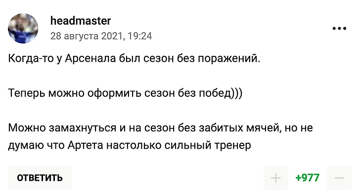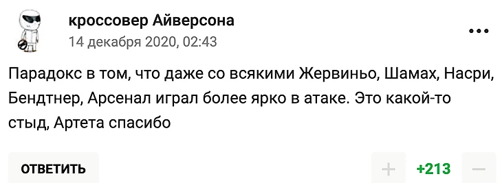 Например, вот такой комментарий заплюсовали под новостью «У «Арсенала» 3 победы в 11 последних матчах – все в Лиге Европы» из 2020-го: