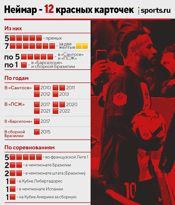 • Пять красных Неймар отхватил еще в «Сантосе». Сначала – в чемпионате штата, затем – в Кубке Либертадорес, когда нацепил на лицо маску. И в чемпионате Бразилии – желтую получил из-за споров с судьей, а красную – из-за аплодисментов ему.