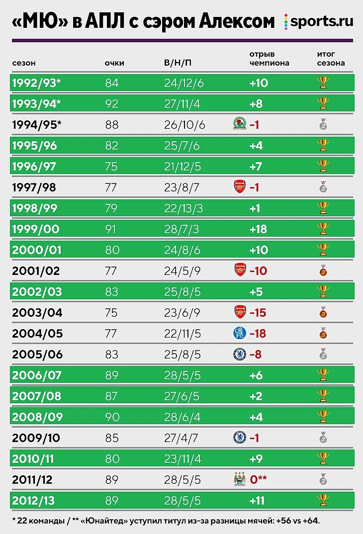 Выиграть чемпионскую гонку у Фергюсона удалось лишь четырем клубам – «Блекбэрну», «Арсеналу» (3), «Челси» (3) и «Ман Сити». Последний сезон сэра Алекса – один из лучших по отрыву от второго места.