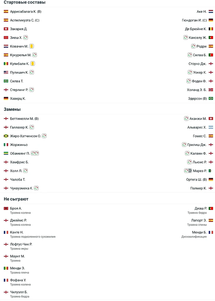 Так и составы на игру, ведь в лазарете у Челси 8 игроков, 6 из которых можно считать твёрдыми игроками основы. У Сити же дела были проще отсутствие 3-х игроков не слишком смущало Пепа. Усугубили дело и вынужденные замены в составе пенсионеров. Всего через 5 минут после начала матча травму получил Рахим Стерлинг, который был заменён Обамеянгом, а на 22-й минуте травму получил Пулишич,которого заменил Чуквуэмека.