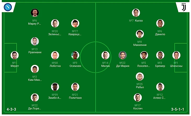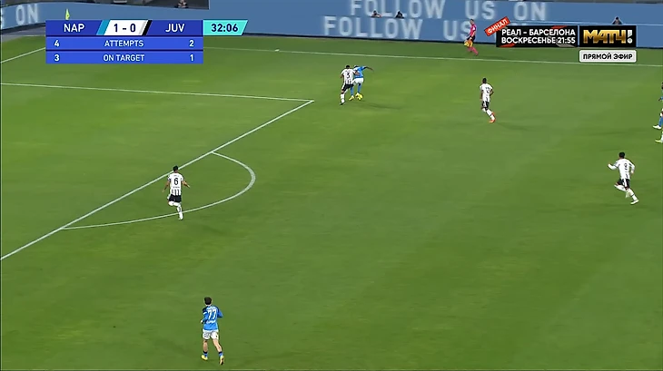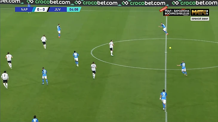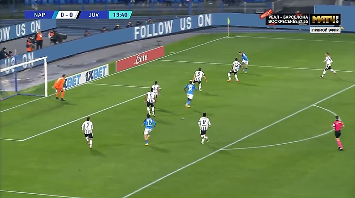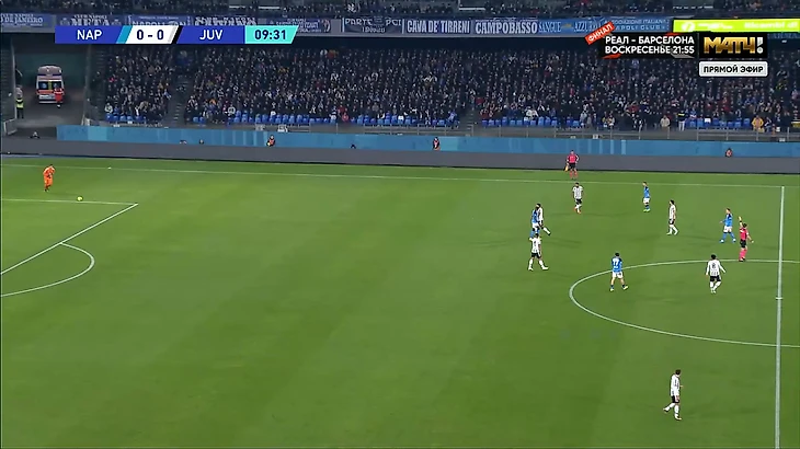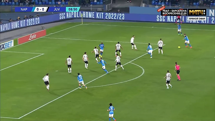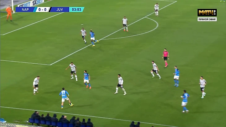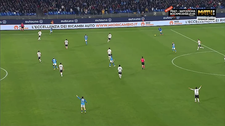 7) Пропущенный гол вынудил гостей играть активнее, однако рисунок игры это не поменяло: до гола у команды Аллегри было 30% владения мячом, а на отрезке между первым и вторым - 34%). Кьеза стал играть выше, его позицию в защите прикрывал Данило. Именно с 15 по 35 минуту «Ювентус» трижды ударил по воротам «Наполи»: дальний удар Ди Марии приняла на себя перекладина, удар Милика после навеса был не сильным, а удар Бремера после углового пришелся выше створа.
