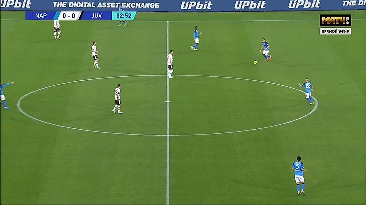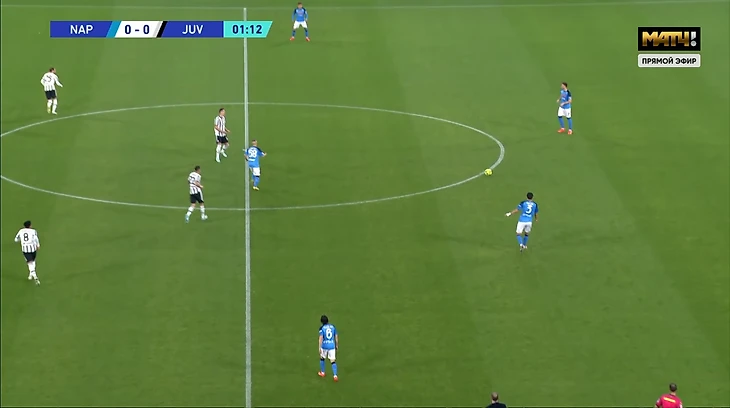 Футболисты «Юве» не играют четко в линию, а рефлексируют на расположение атакующих игроков «Наполи». В данном случае Кьеза чуть ближе к Кварацхелии, Данило – к Мариу Рую, а Бремер играет по Осимхену.