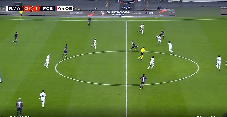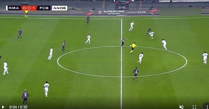 Бускется не очень удобно отпасовал в центре поля, но Де Йонг успел развернуться и уже в падении отдать передачу вперед. Защитники "Реала" выдвинулись к мячу, благодаря этоиу Гави и получил возможность убежать в штрафную.