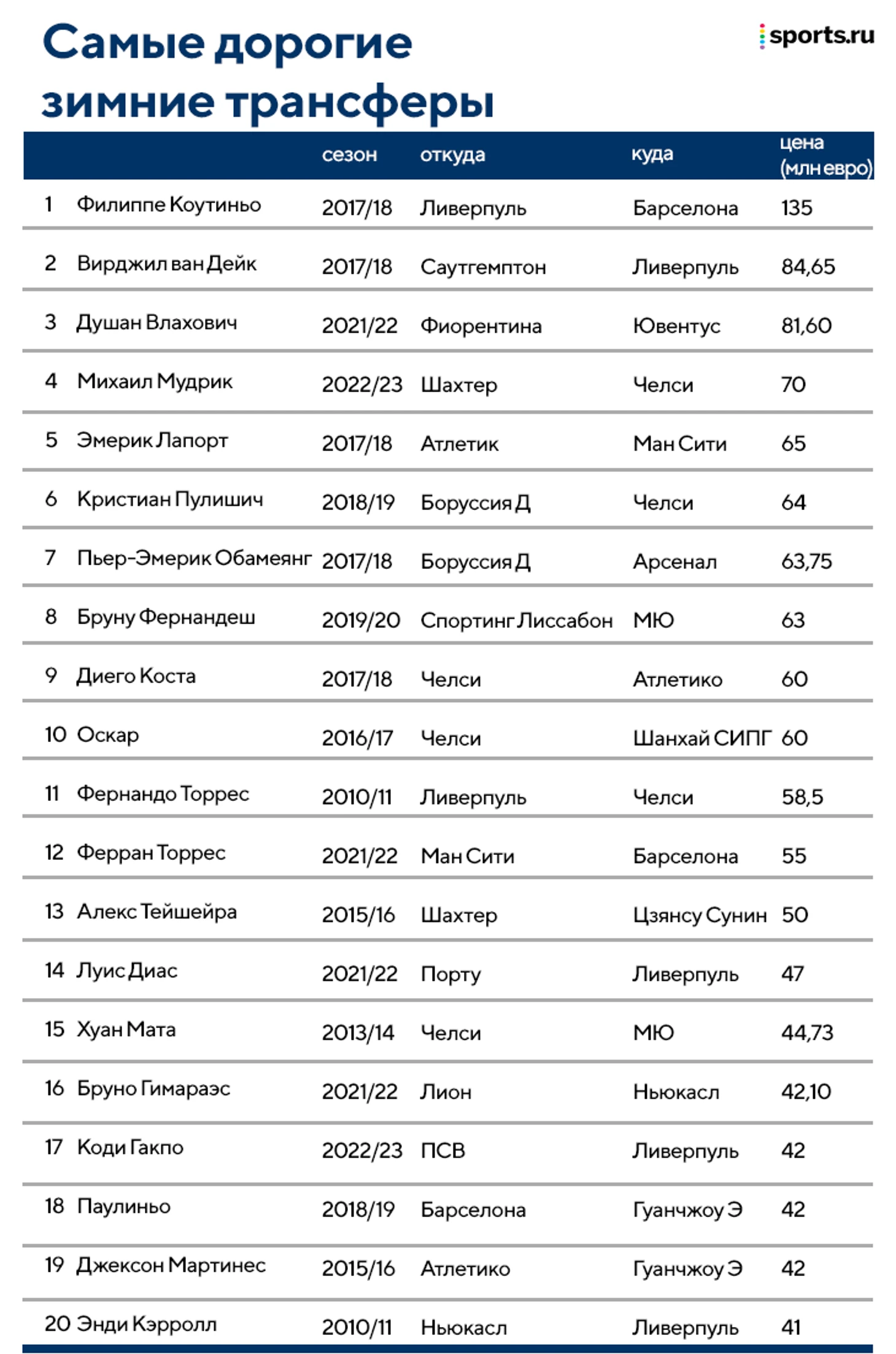 Топ-20 крупнейших трансферов зимы: Мудрик стал четвертым, самый дорогой – у «Барселоны»