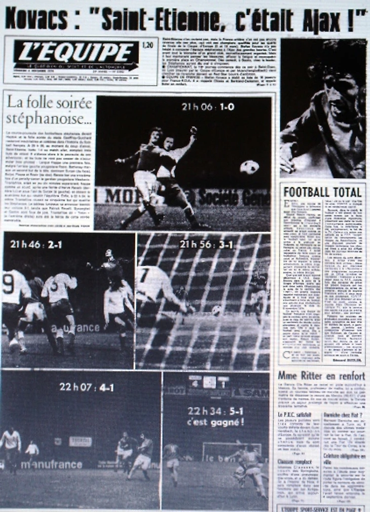 Восторг охватил Францию: наконец-то промелькнул луч света в тягостной тьме!!! На снимке- первая страница ведущей французской спортивной газеты Экип, вышедшей на следующий день после матча. На самом верху страницы цитата от тренера сборной Франции Стефана Ковача, дважды подряд (1972 и 1973) бравшего Кубок Чемпионов: «Сент Этьенн- это Аякс».Чуть ниже- начало отчета о прошедшем матче под заголовком: «Сумасшедший вечер стефануа...». Отчет сопровождается снимками каждого из французских голов с французским временем (матч начался в 20.30 вечера).