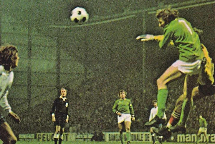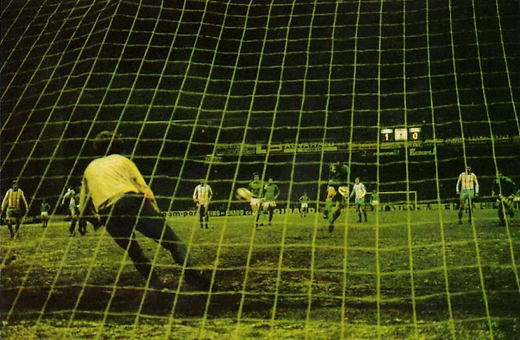 12 мая 1976, Глазго, финал Кубка Чемпионов, Бавария- Сент Этьенн. 39-я минута, отчаяние охватило Францию после того как при счете 0-0 Жак Сантини (в зеленой футболке, на переднем плане) поражает перекладину. Считается, что если бы перекладина не была квадратной, мяч бы отскочил в сетку ворот...