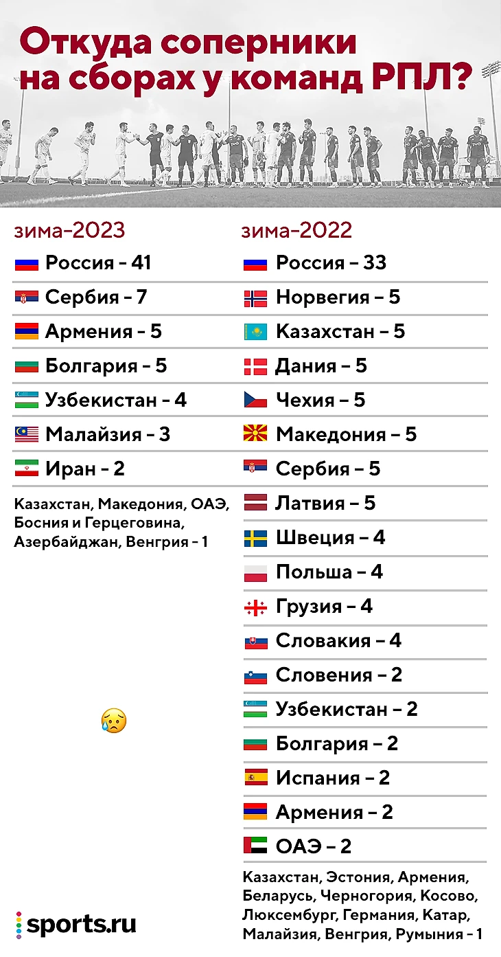 Давайте сравним: с соперниками из каких стран клубы РПЛ все-таки планируют – по крайней мере пока – сыграть ближайшие товарищеские матчи, а с кем играли в прошлом году, на сборах незадолго до обострения ситуации на территории Украины.