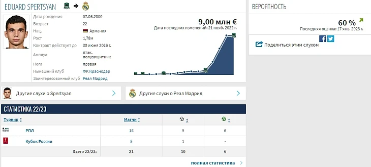 Согласно Transfermarkt, мадридский «Реал» всерьез намерен подписать армянского полузащитника Эдуарда Сперцяна. Вероятность трансфера оценена в 60%.