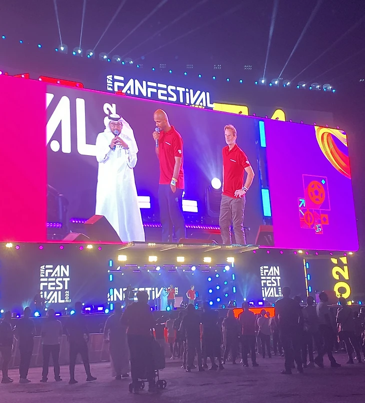 В промежутке между играми в фан-зоне выступал Омар Монтес. Оказывается, это довольно популярный испаноязычный исполнитель, чьи клипы набирают в ютубе по 50-60 млн просмотров. Иногда там собирались бывшие футболисты. Вот на сцене Франк де Бур и тот самый вратарь из Омана Али Аль-Габси.