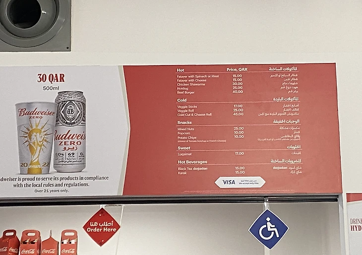 Еда на стадионе, для перевода в рубли нужно умножить на 17. Не вижу смысла лишний раз обогащать мафию из ФИФА. По-моему, лучше отнести эти деньги работягам из города, благо там вкуснее, дешевле и намного разнообразнее. В Дохе полно кафе, ресторанов, киосков, где есть итальянская, турецкая, индийская, иранская, афганская, пакистанская, палестинская, йеменская и другая кухня.