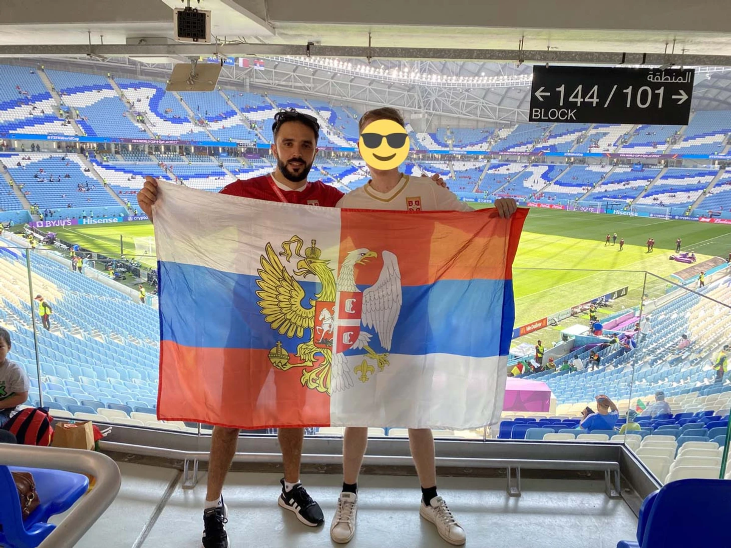 На матчи Сербии брал с собой русско-сербский флаг. Сербам он, похоже, понравился – пару раз меня останавливали и просили сфоткаться. Одним из таких парней был Дражен с его другом из маленького городка Вишеград (в Республике Сербской, недалеко от Фочи). Парни работают в Катаре, в сервисе, прямо в отеле сборной Сербии. Вот они листают совместные фотографии с Костичем, Влаховичем, Радоничем, вот Неманья Максимович играет на приставке... Снимков с футболистами на телефоне бесчисленное множество. Кстати, билеты на матч (как и на Сербия – Бразилия ранее) им подогнали как раз сербские футболисты.