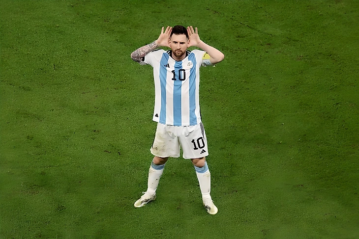 На ЧМ 2022 в Катаре в матче против Нидерландов Месси забил пенальти и отпраздновал гол необычным способом. Приложил ладони к ушам напротив скамейки, на которой сидели Луи ван Гал и его команда.