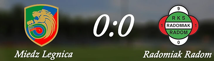 Гжегож Мокры выставил в старте двух новичков своей команды, Мариуш Левандовски пошёл дальше и с первых минут вышла сразу четверка футболистов, присоединившихся к «Радомяку» зимой. Долгое время команды не тревожили вратарей соперника. «Медзь» владела игровым преимуществом, но оно не приводило к чему-то опасному, пока в середине тайма Гуллен после одного из стандартов не пробил в сантиметрах от штанги ворот Кобыляка. Гости моментально ответили контратакой четыре в четыре, которую слабым ударом в руки Абрамовичу завершил Машадо. Куда опаснее было после стандарта радомцев. Давид Абрамович мог огорчить своего брата, защищавшего ворота гостей, но один из защитников легничан успел заблокировать удар крайнего защитника.