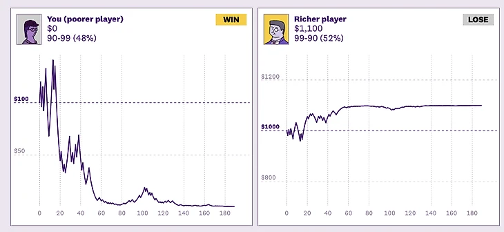 Меньше чем через две сотни циклов вы потеряете все, хотя на какое-то время уйдете в плюс. При этом вы выиграете примерно половину партий, то есть в монетке будете ничем не хуже соперника. Но он заберет все ваши деньги.