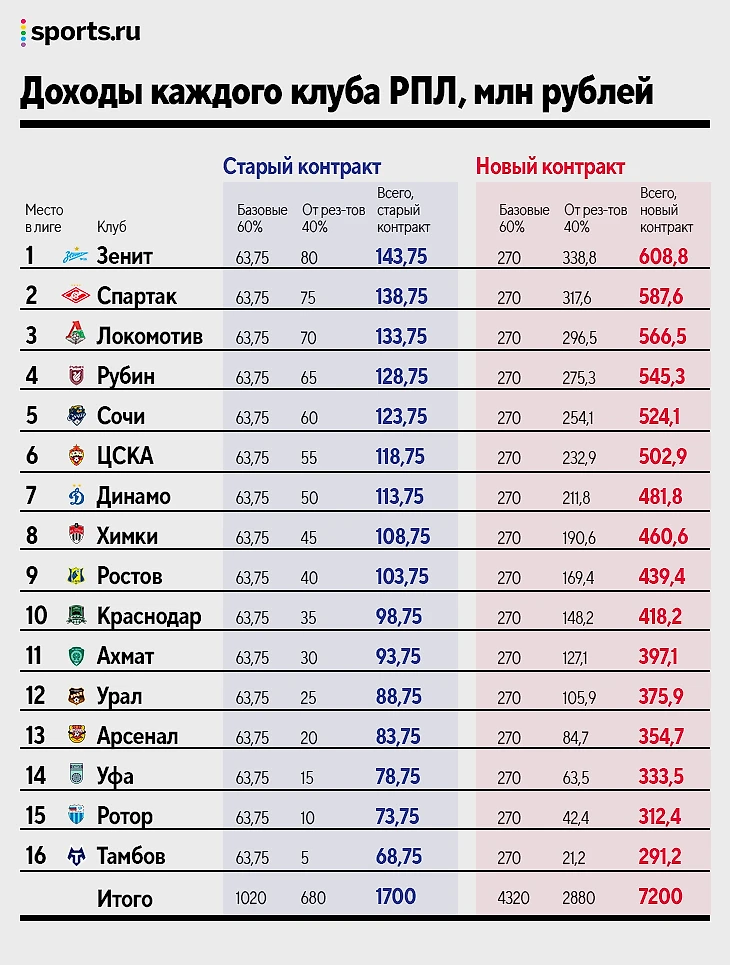 От продажи домашних ТВ-прав поровну распределяется только 50% дохода, международные поступления делились поровну (уже действует другая схема) без дополнительных условий. Итог – только чуть более 30% общего дохода распределялись в зависимости от рейтинга клубов, остальное – равными частями на всех.