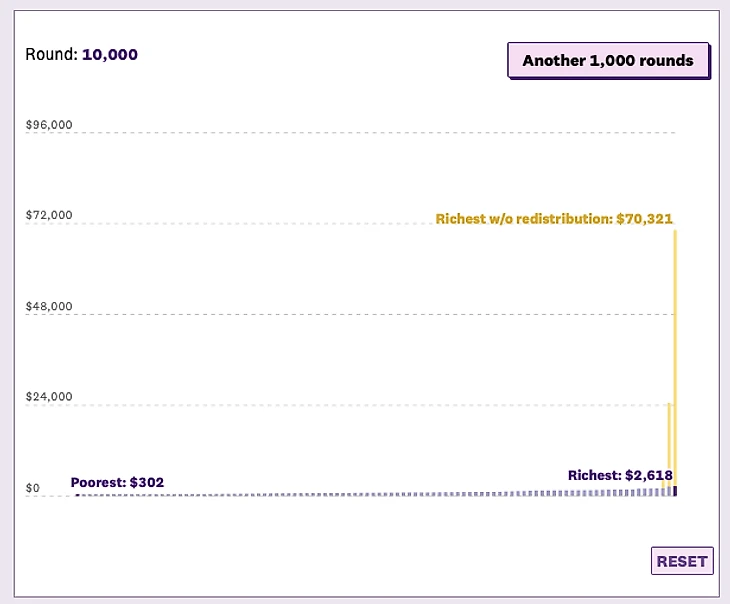 Итог: у богатейшего участника после введения налога было около 2600 долларов по итогам 10 тысяч раундов, у беднейшего – 300. Да, тоже расслоение, но уже не такое катастрофическое.
