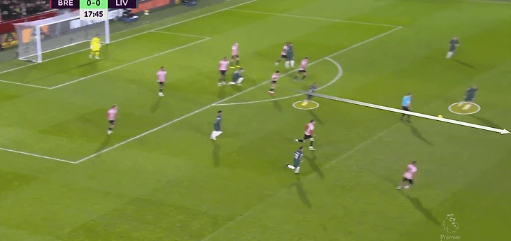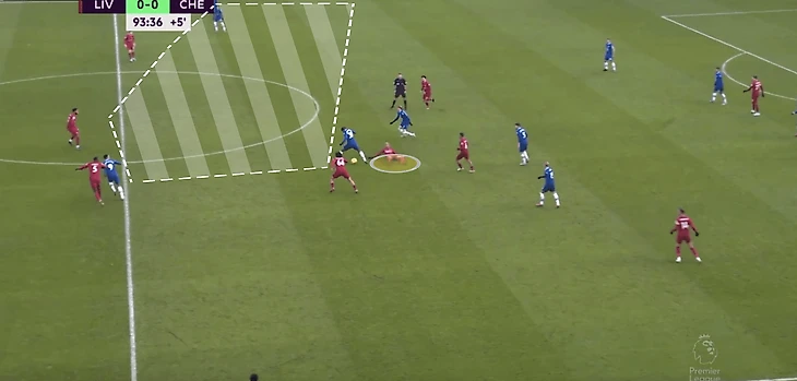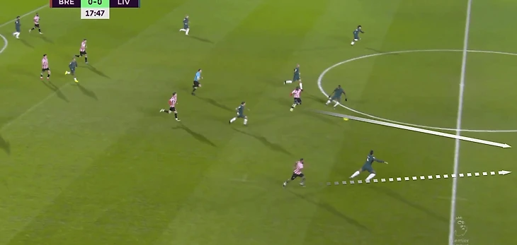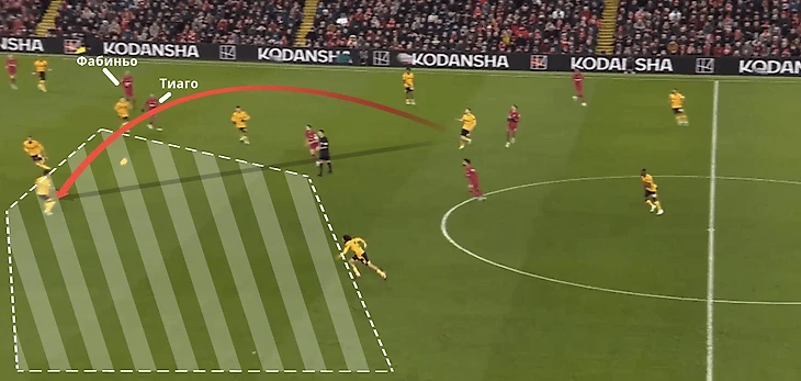 А дальше все пугающе просто: мяч просачивается в канал между Фабиньо и Тиаго. Что приводит к опаснейшему моменту.