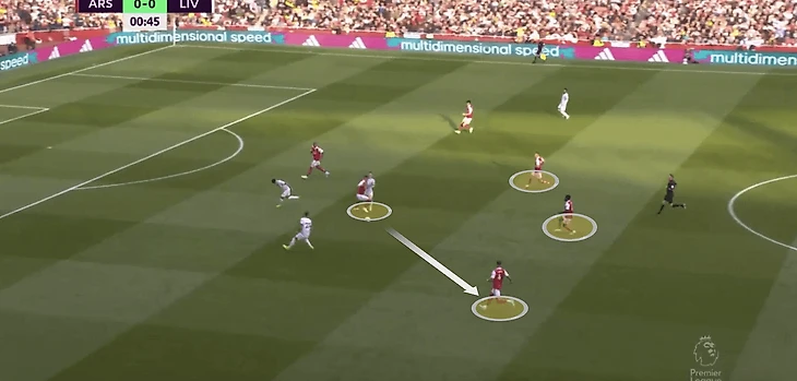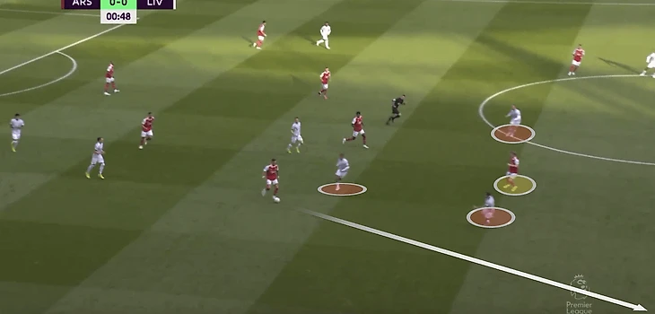 Бен Уайт берет паузу и дожидается Тиаго, а Эдегор (выделен желтым) стягивает внимание двух игроков в центре. Тем временем где-то за кадром остается одинокий Сака, который разгонит эту атаку, и «Ливерпуль» пропустит на первой минуте.
