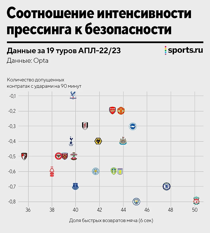 Любопытно, что у Пепа, футбол которого заточен на контрпрессинг, примерно та же проблема – риски при давлении почему-то возросли. При этом «Арсенал» при интенсивном прессинге (медианное значение отбора – 8 секунд) почти не проваливается.